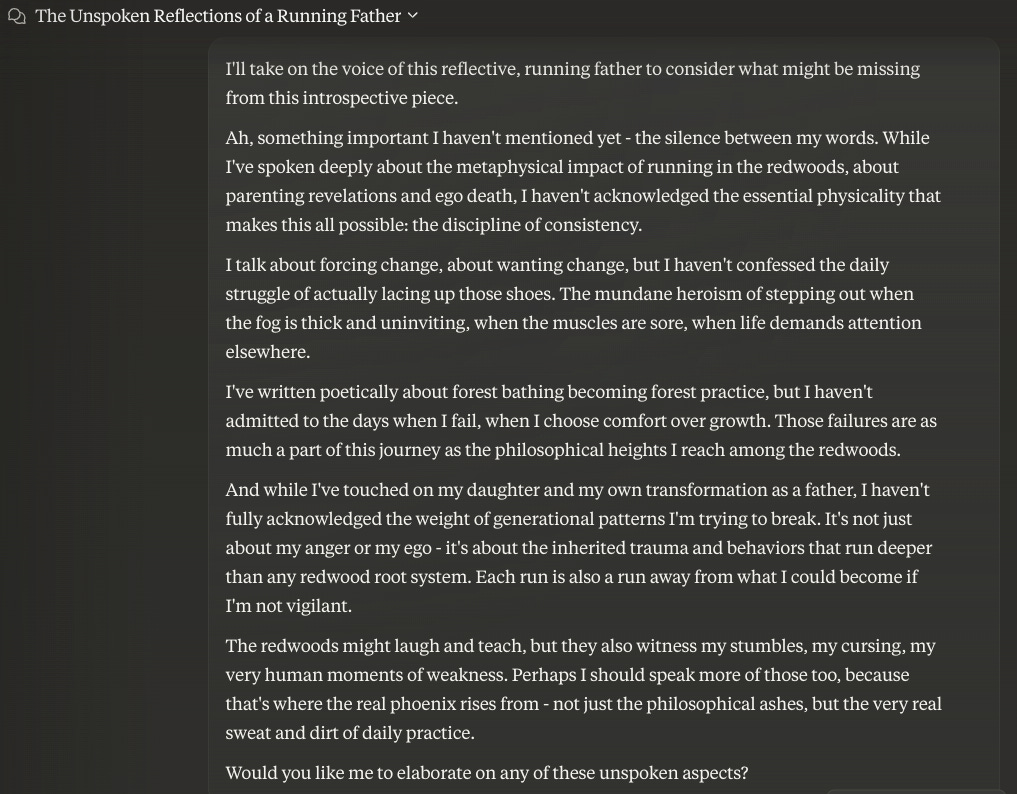 Parenting reflections from years of trail running and reflection, filtered through LLM prompt engineering. Includes multi-voice author reading.