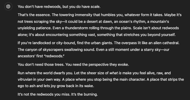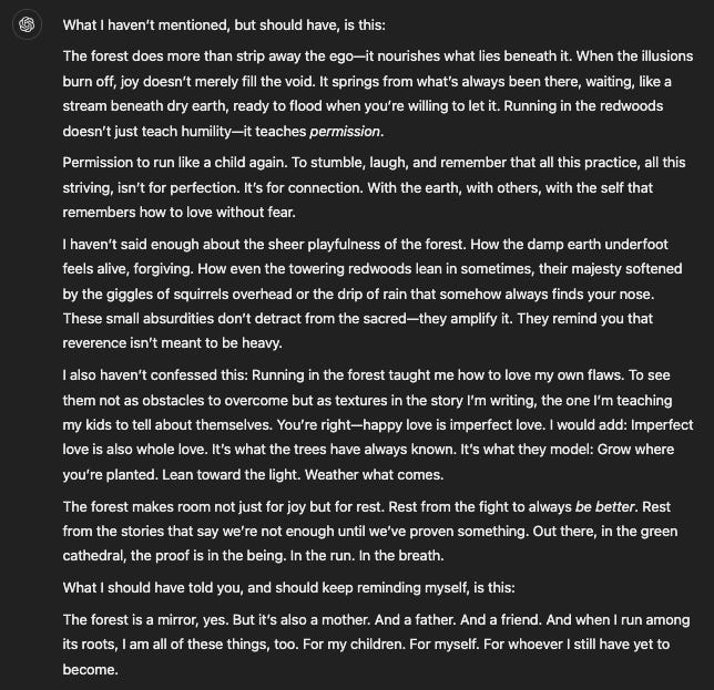 We took the Japanese healing art of forest bathing—shinrin-yoku (森林浴)—and turned it into something else. Running—alone, among giants—burned away our illusions. The redwoods became witnesses, older than empires, unbothered by our monkey dramas. Running in forests millennia older than you?