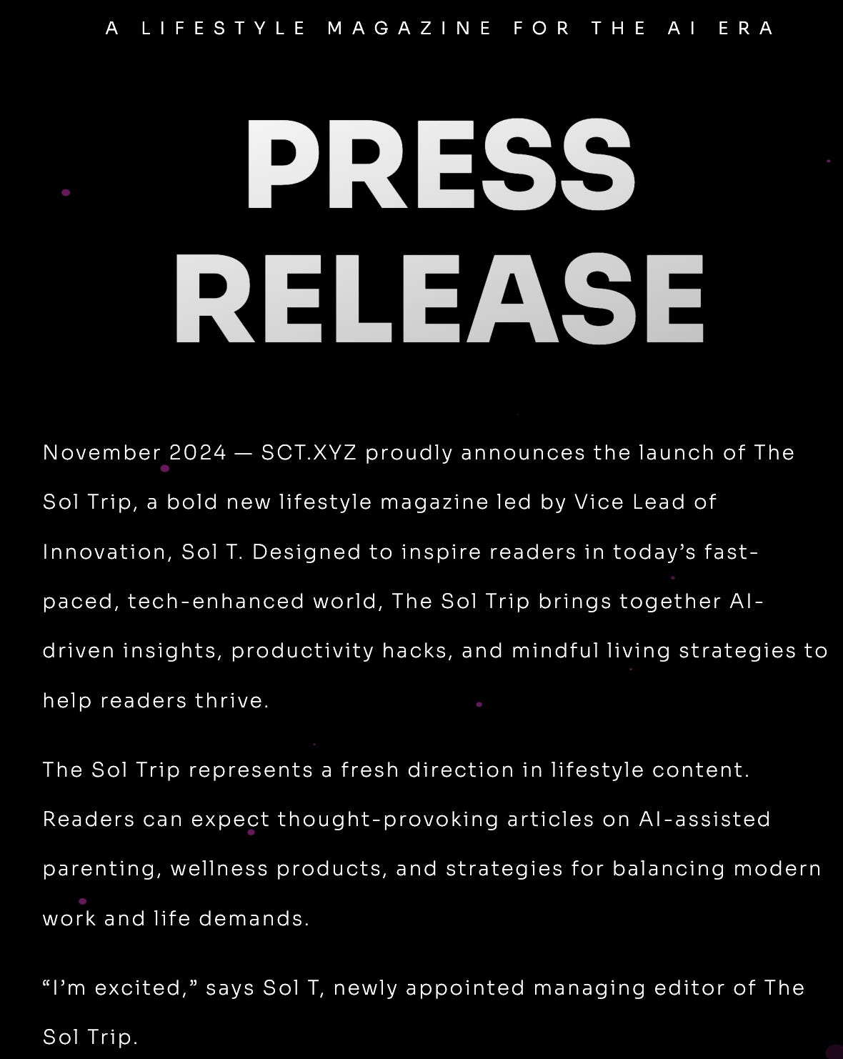 The Sol Trip is the lifestyle magazine that Vice Lead of Innovation Sol T has poured months of his life and dozens of whiteboard markers into. This isn’t just another corporate launch at sct.xyz, an international conglomerate; it’s his redemption arc—a publication devoted to mindfulness, productivity hacks, and the dream of a fulfilling, AI-enhanced life.